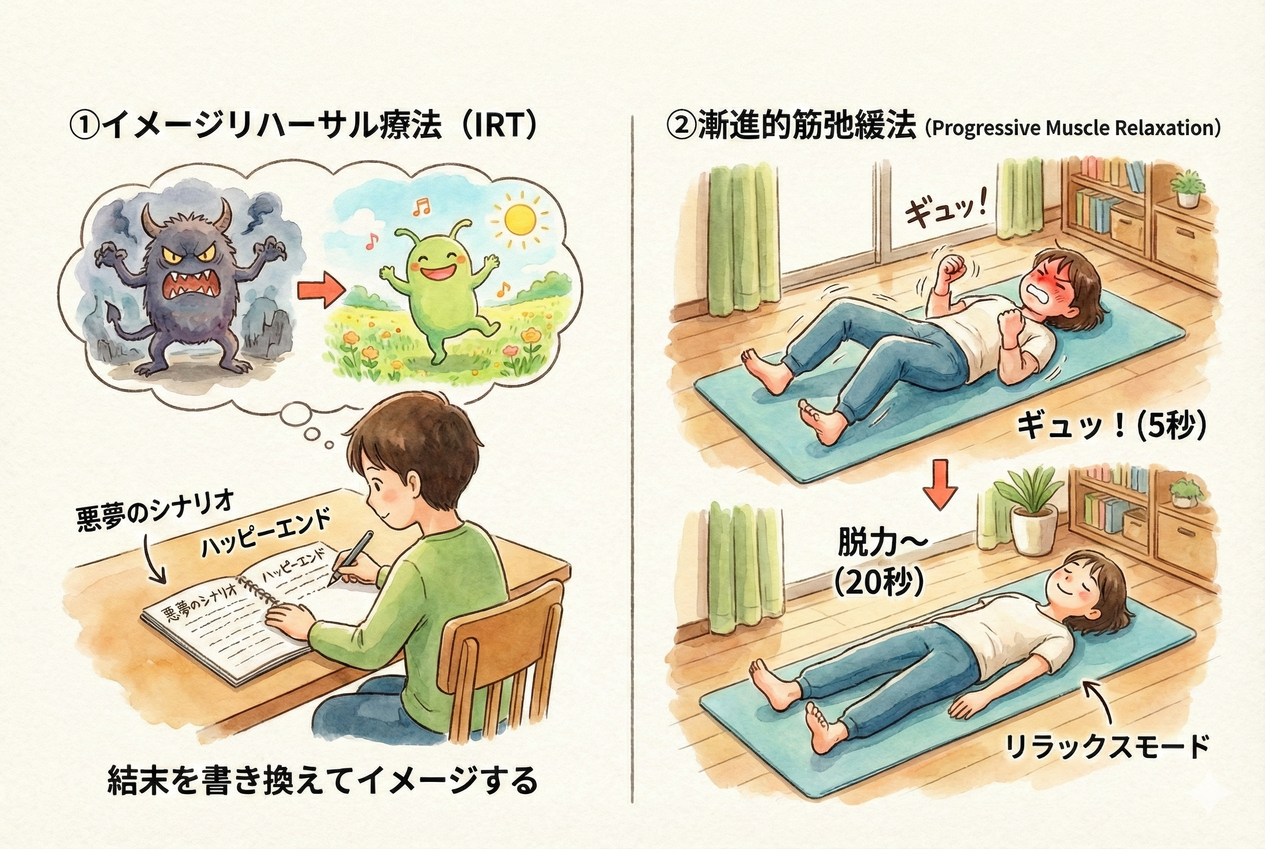 悪夢を減らすためには、脳に「ここは安全だよ」と教え込むトレーニングが有効です。