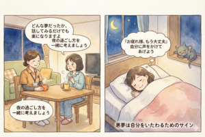 悪夢を怖がるのをやめて、「教えてくれてありがとう」と思えるようになったとき、あなたの夜は少しずつ穏やかさを取り戻していきます。