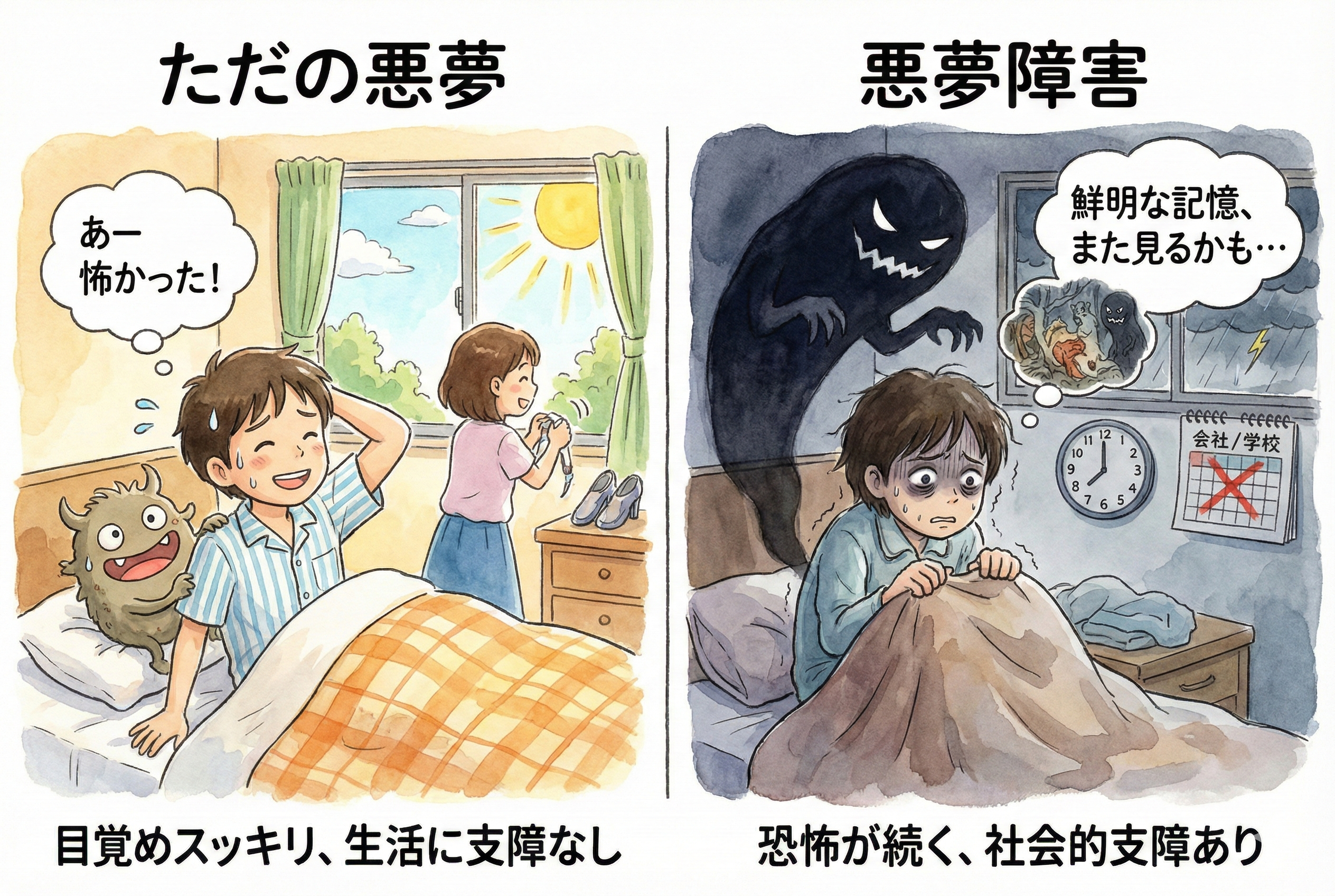 週に何度も悪夢を見て、そのせいで「寝るのが怖い」「日中もずっと不安で集中できない」という状態が続くなら、それは単なる夢ではなく、「悪夢障害(Nightmare Disorder)」という睡眠障害の一種かもしれません。