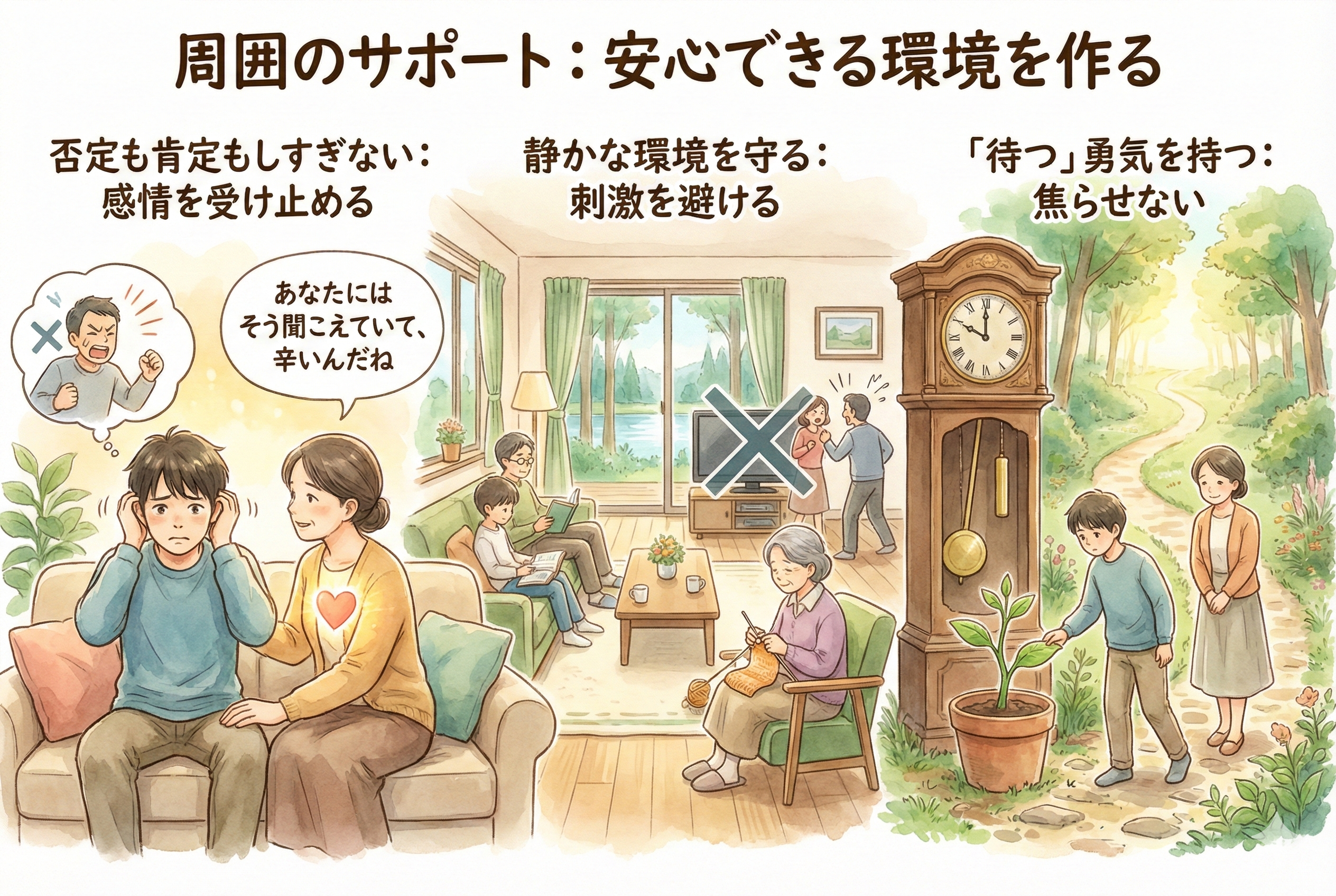もし本人が「悪口が聞こえる」と言っても、「そんなの嘘だ」と否定するのは逆効果です。「あなたにはそう聞こえていて、辛いんだね」と、その感情自体を受け止めてあげてください。