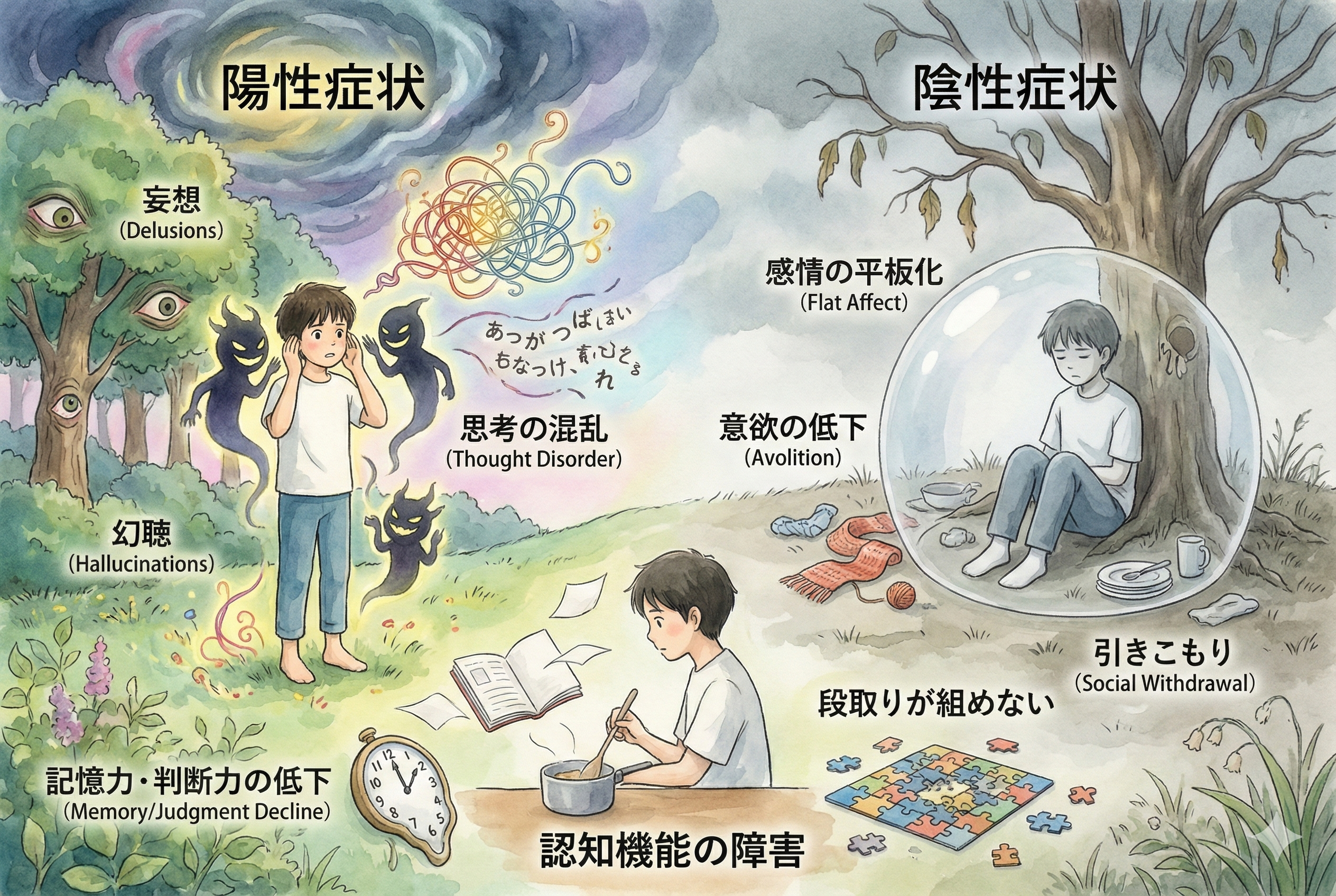 症状は人によって千差万別ですが、大きく分けると「陽性症状」「陰性症状」「認知機能の障害」の3つがあります。