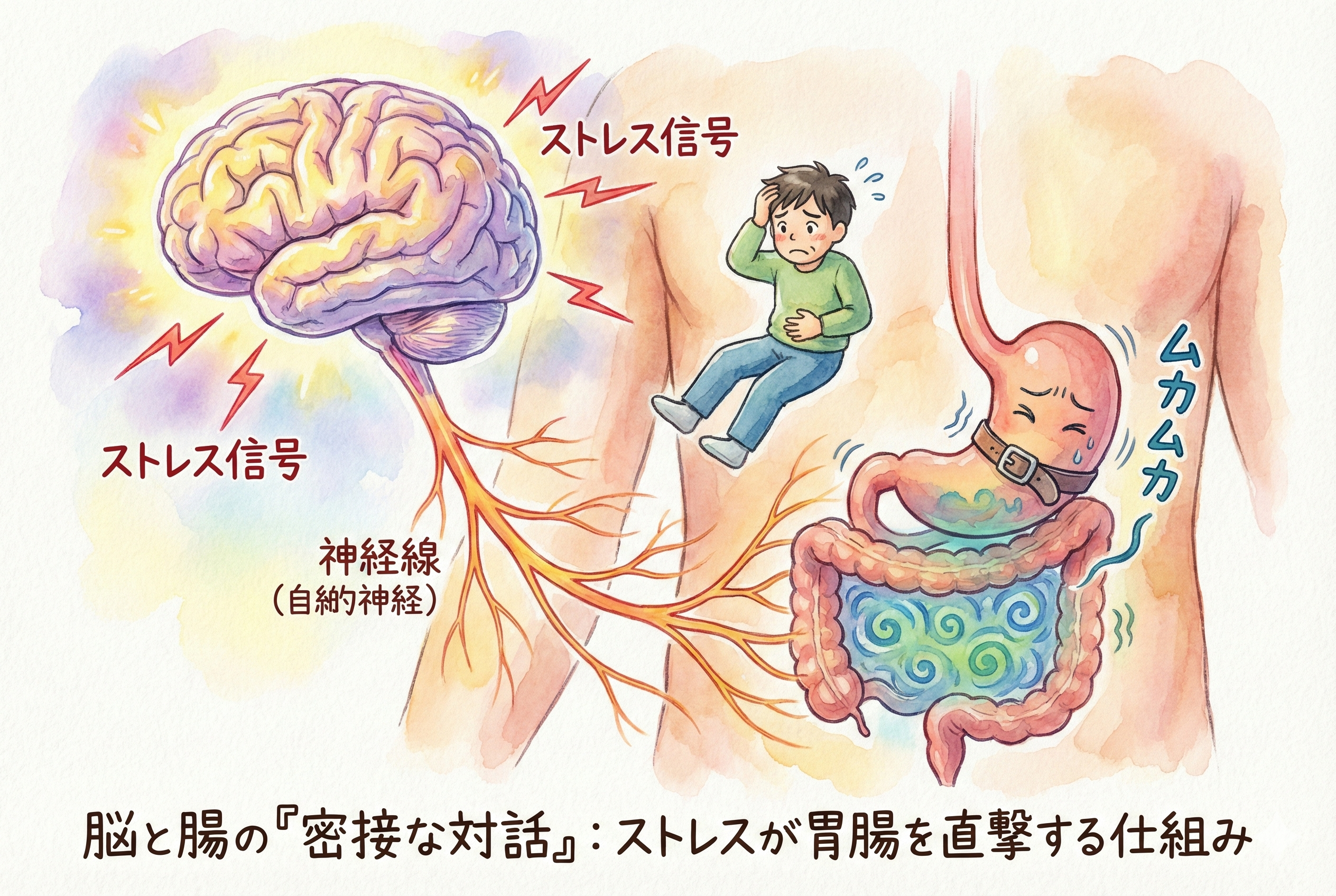 私たちの身体は、ストレスを感じると「戦うか、逃げるか」のモードに入ります。これを司るのが交感神経です。交感神経が優位になると、心臓や筋肉に血液が優先的に送られる一方で、**「今すぐ必要ない」と判断された胃腸の動きは後回し(抑制)**にされます。